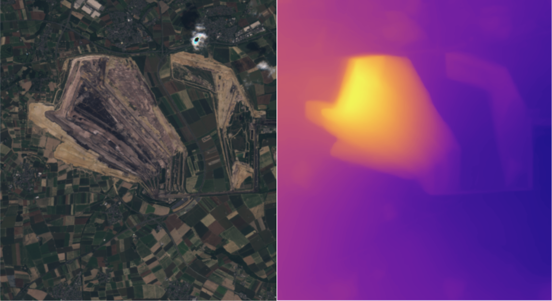 AmoKI aims to automate monitoring of open-pit mines using machine learning on open geospatial data (aerial imagery, Sentinel-2). In partnership with RWTH Aachen’s Institute of Mineral Engineering and Geologischer Dienst NRW (funded by BMBF), the team fine-tuned monocular depth-estimation models to infer terrain elevation, estimate mine depth and volume changes, and flag environmental impacts - reducing costly and risky on-site inspections.
