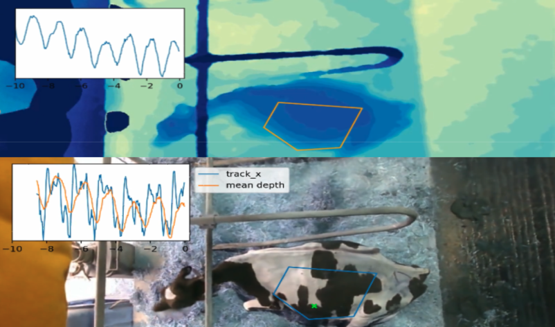 KAMI is a dida project for contactless respiratory monitoring in dairy cows using RGB depth cameras and visual event tracking. The goal is an earlier detection of stress or illness through increased breathing activities to improve animal welfare and farm operations. As a result, we developed a point-tracking model that uses RGB and depth information to track a cow’s breathing and which deviates less than three breaths per minute from sensor ground truth. This project was a joint effort with colleagues from ATB Potsdam, LVAT, and the University of Hildesheim.